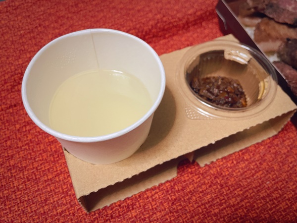 お弁当を購入すると牛テールスープが無料で付いてくるのは変わらず。このサービス素直に嬉しい。そして、この日は新商品の試食品もついていました。(牛しぐれ煮のような甘辛いやつ。)
