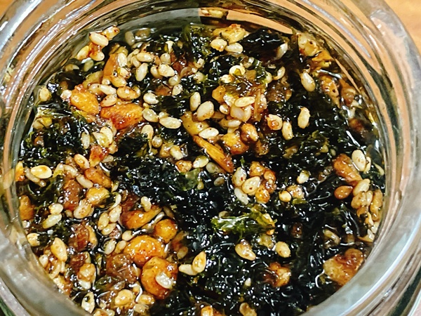 中身はこんな感じ。見た感じハラペーニョの主張は弱めな感じというか、見えない。けれども、このあおさとガーリックのシャリシャリ感がなんともたまらない。ノーマルのあおさも美味しかったので期待だけが膨らんでいきます。