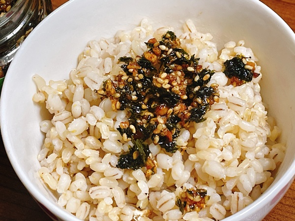 初めはやっぱり定番のごはんでいただきます。今回も玄米と大麦ご飯に乗せてみました。