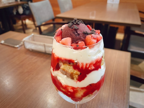 ベリーのシャーベットと下のコーンフレークとベリーソース、クリームを混ぜながら味変しながら食べたのですがこれからの季節にピッタリのさっぱりとしたパフェですね。
