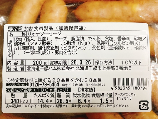 100gあたり340kcalでたんぱく質は14.4g、脂質28.5gで炭水化物は6.4g。以前紹介した『大阪羽曳野マイルドウインナー 420g』に比べてカロリーも脂質も多いですね。(チーズだけの差じゃない気がする。)この辺、ちょっと気になります。