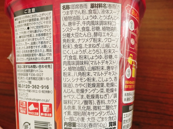 という事で、いつもの原材料。春雨はさつまいものでん粉から作られてるやつですね。液体スープは醤油、豆板醤、唐辛子、牛肉風味調味料がメインで香辛料は本格的なものが色々使われていますね。これは期待値爆上がり!あと、乾燥の湯葉が入っているのも気になります。