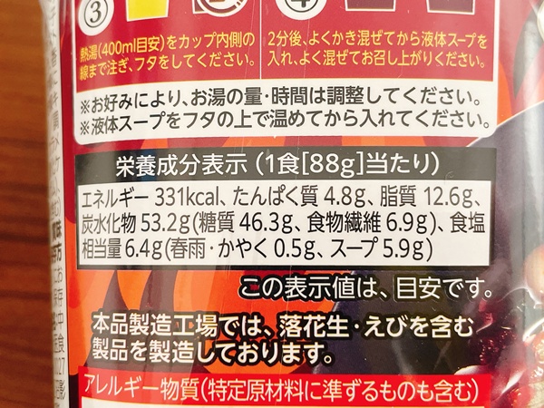 カロリーは331kcal、たんぱく質4.8g、脂質12.6g、炭水化物53.2g(糖質46.3g、食物繊維6.9g)、食塩相当量6.4g。脂質は多いけどカロリー低めで、糖質も46.3gならダイエット中でもいけますね。