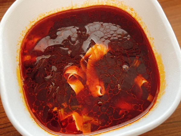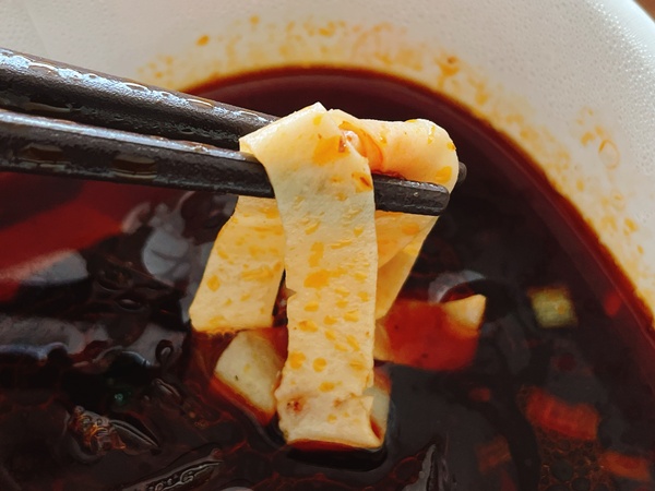 熱湯注いでふたして2分待って、液体スープ入れて混ぜ混ぜした所です。とにかく、スープは真っ赤!乾燥湯葉が麺のように見えます。そして香りが…私の好きな火鍋に似ていて食べる前から絶対に美味しいだろうなという予感…。