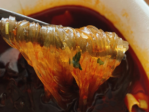 早速、さつまいもの春雨からチェック。緑豆春雨に比べて平麺でムニムニしています。熱いのを少し無理して食べてみると…