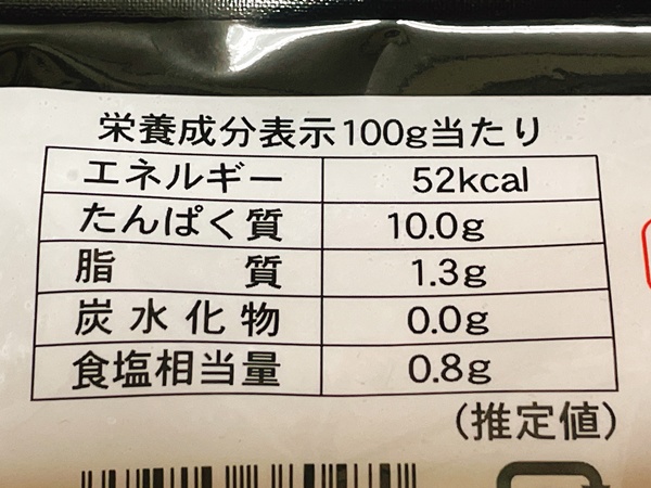 カロリーはこちら。100gあたり52kcalでタンパク質は10g、炭水化物量は0g!と、ダイエット中の人には嬉しい食材!