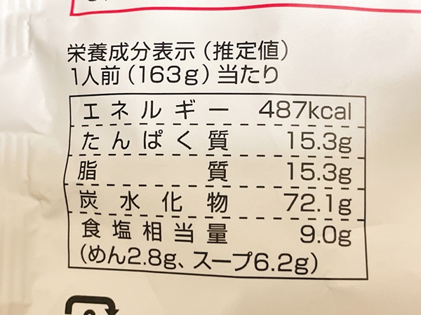 カロリーはこちら。487kcal、たんぱく質15.3g、脂質15.3g、炭水化物72.1g、食塩相当量9gとなっております。炭水化物やっぱりすごいなあ。それでも食べるのをやめられない、これがラーメンマジック。