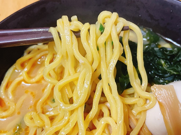 麺は中太麺で、結構黄色みが強め。生麺なので茹で加減をうまく調整しないといけないのですが、中太麺なので細麺よりは失敗は少ないです。