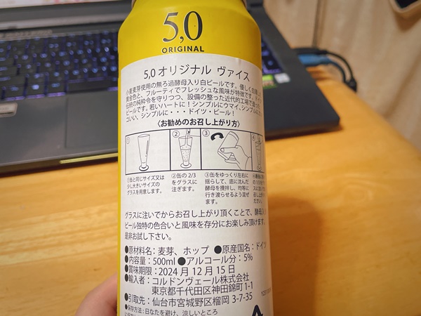 小麦麦芽使用の無ろ過酵母入り白ビールで、注ぎ方も後ろに書いてあって親切。アルコールは5%で一般的なビールですね。