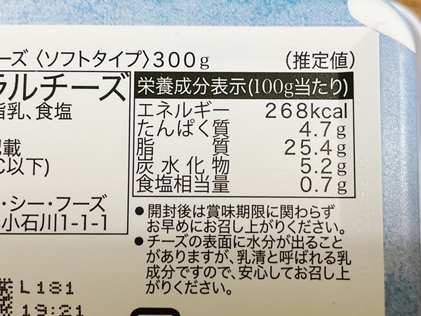 100gで268kcal、たんぱく質は4.7g、脂質は25.4g、炭水化物は5.2gとなっております。チーズなので脂質多めだけど、こればっかりは仕方ないよね。