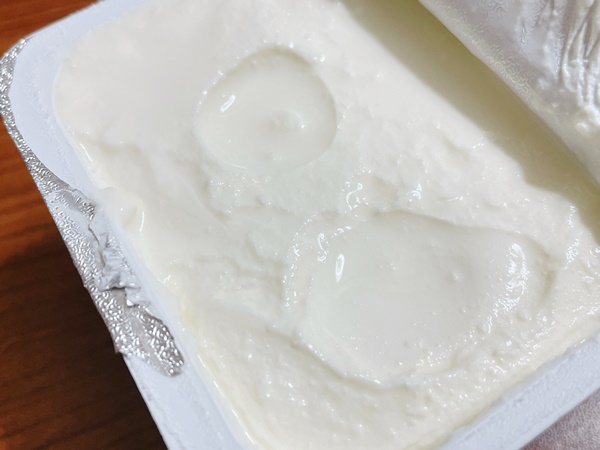 開けてみるとこんな感じです。水分が浮いてでていてクリームチーズというよりもギリシャヨーグルトっぽい感じ。