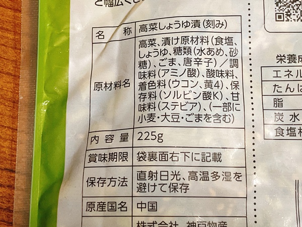 業スーの高菜漬けは醤油漬けとなっております。原産国は中国。まあ、高くなったとは言えお安いものね。