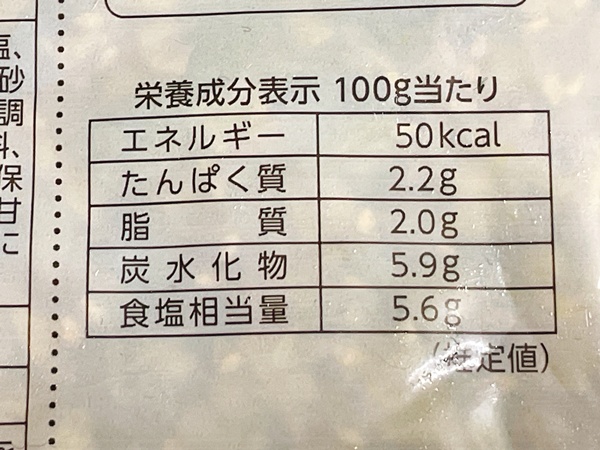 100gあたりカロリーは50kcalでたんぱく質は2.2g、脂質は2.0g、炭水化物は5.9g、そして食塩相当量は5.6gとなっております。カロリーは低いのですが漬物なので塩分多いので食べ過ぎは注意。いや、そこまで一気に食べることはないと思うけど…。