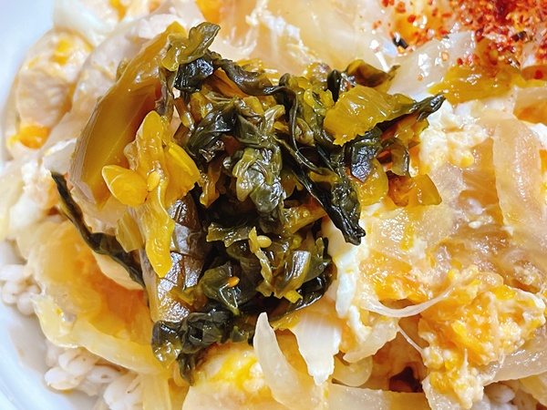 今回は親子丼に乗せてみたのですが、この業スーの高菜漬け細かくカットしているので使いやすい。そして食べてみると、醤油漬けですが醤油の主張はそこまで強くなく塩味の方が強いかな。そして、こちらは高菜の醤油漬けで唐辛子が少し入っているようなのですが、辛いもの好きな私にとっては辛さは殆ど感じませんでした…。