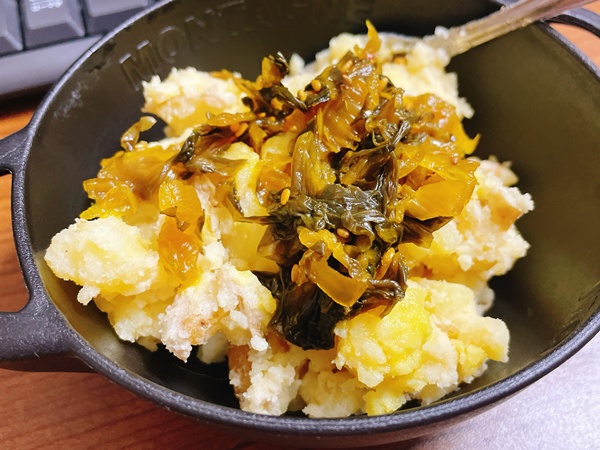 これ…ポテサラのめちゃくちゃいいアクセントになってくれます。写真では上に乗せてますが、混ぜて食べるともっと美味しい。ちなみに、高菜の塩味があるのでマヨネーズは少なめにする方がカロリー的にも健康的にもおすすめ。市販のマヨネーズたっぷりのポテサラにミックスする場合は高菜は少量にするとバランスが良くなると思います。あと、ポテサラに入れて気がついたのですがタルタルソースのピクルスの代わりに高菜入れても良さそう。