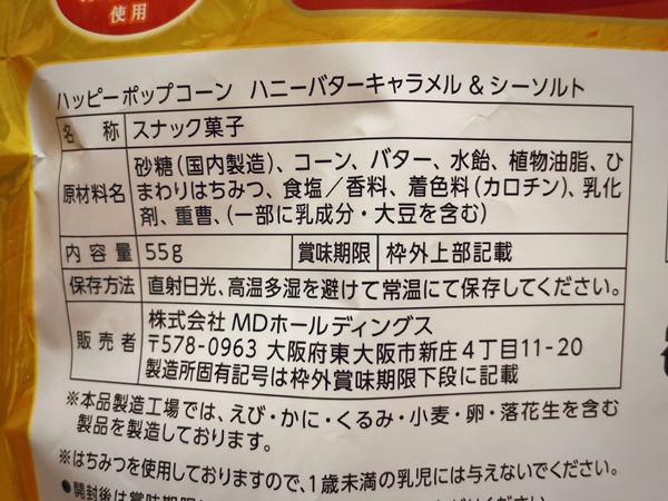 1袋55gと量はかなり控えめなんですが、カロリーは292kcal。炭水化物量は36.6g。ただポップコーンなので、多少は食物繊維も含まれていると思います。