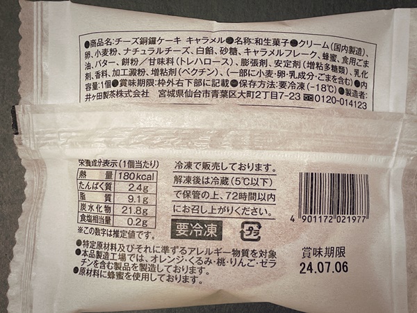 まず初めに紹介したいのはこちらの『酪餡堂(らくあんどう)チーズ銅鑼ケーキ(キャラメル)・税込200円』価格は2024年5月中旬&店舗での価格となります。