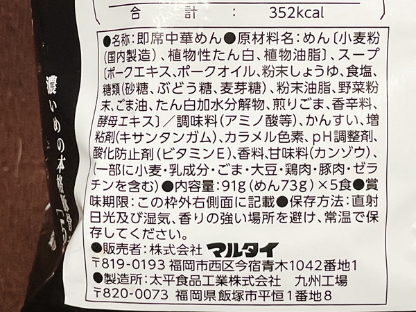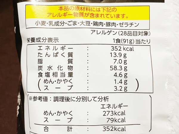 カロリーはこちら。ノンフライ麺ということもあり豚骨ラーメンですがカロリーは低め。