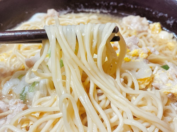ノンフライでストレート…そしてマルタイ!マルタイの麺は乾麺だけど生麺感があっていい。このストレート麺が豚骨スープをまとうと、また旨さ倍増です。