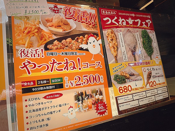 店員さんが、単品飲み放題を頼むのならば90分飲み放題のついた『復活!やったね!コース』がお得ですとおすすめしてくれました。お得なコースを教えてくれるの嬉しい。
