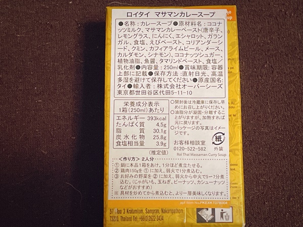 後ろを見ますと『ロイタイ マサマンカレースープ』と書いてありますが…正面は『Massaman Curry Soup』と書いてあるのでマッサマンと呼びます。