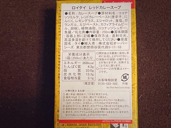 ベースはココナッツミルク、その他日本人の私の知らないハーブっぽいものなども入っておりますね。さすが本場のタイで売っている商品!だから好き。