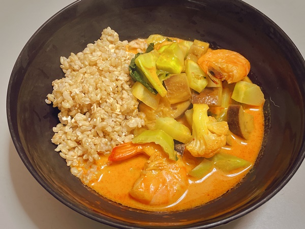 箱には鶏肉と書いていたけど、まさかの鶏肉なくて…原材料にえびペーストとあったのでエビと野菜入れて煮込んだレッドカレーがこちらです。