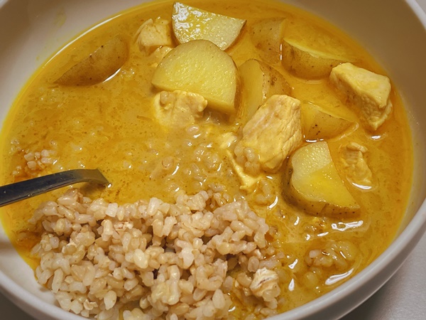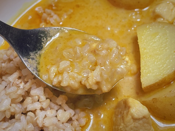 ではいざ実食!カルディの説明では辛さが控えめということでしたが…普通に辛さありました(笑)辛さというかスパイスが効いてたから、そういう印象になったのかな?私は辛いものが好きなので普通に好き。ココナッツの風味+スパイスの風味を感じられるのがいい。