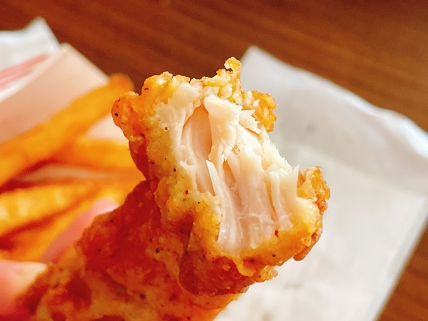 横から見るとこの薄さ…(部位によるとは思うのだけど…)普通のチキンをカットしたみたいな感じで、セットで500円という事は単純計算で1個250円