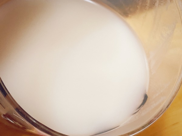 グラスに注ぐと、写真ではちょっと分かりづらいのですが、ほんのりグレイがかった色の黒豆マッコリです。