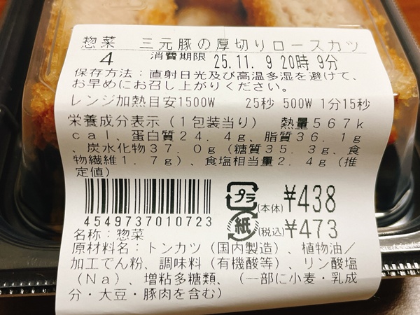 そしてカロリーは567kcal、たんぱく質24.4g、脂質36.1g、炭水化物37g、(糖質35.3g、食物繊維1.7g)、食塩相当量2.4gとなっております。とんかつだもんね、揚げ物だもんね…そりゃカロリーそのくらいにはなるよね。