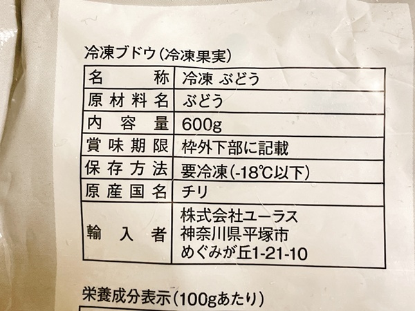 いつもの裏面チェックですが冷凍ぶどうなのでシンプル。ぶどうの種類は不明。