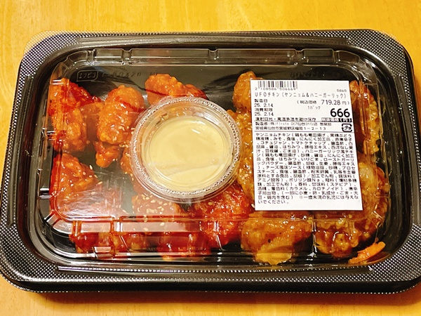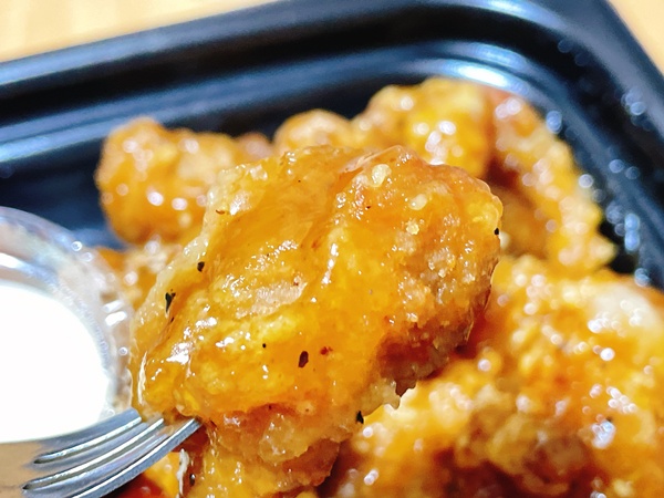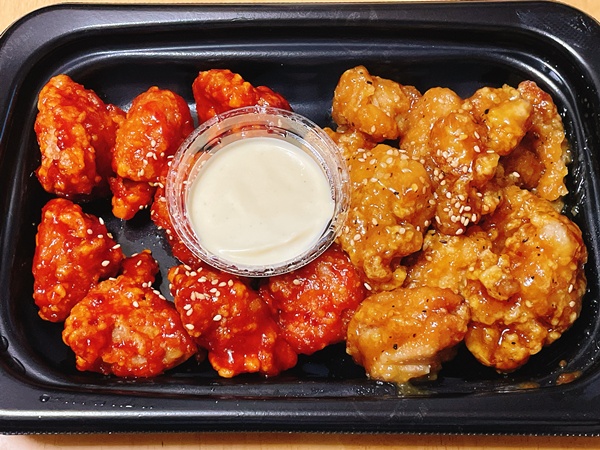 さて、フタを外すとこちらのチキンたちです!ヤンニョムとハニーガーリックが各8個あるので16個!!+チーズソース。ソース付けて1個あたり44円とは…これはお惣菜としてはかなりコスパいいと思う。