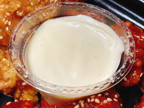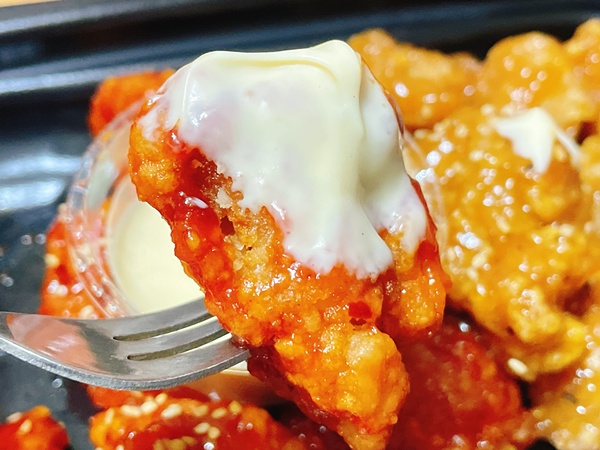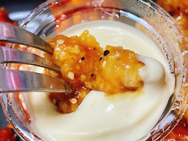 このチーズソースをつけると辛さがマイルドになるので、これならお子さんや辛いのが苦手な人でも大丈夫な気がします。ヤンニョムチキンに関しては、そのままで食べても美味しいのですが、辛いのが苦手な方に関してはチーズソースを付けて食べる方がおすす!
