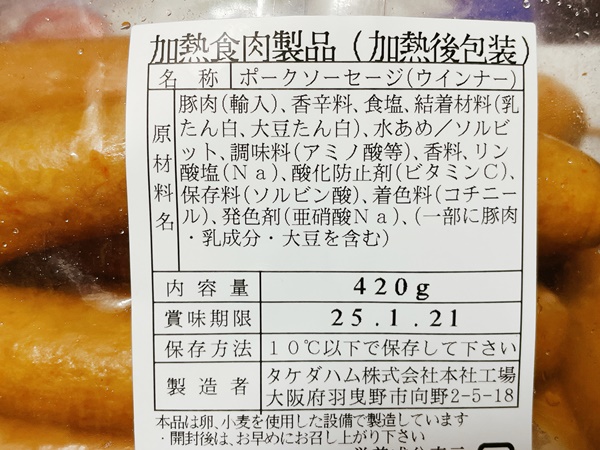 こちらが『大阪羽曳野 ピリ辛ゆず風味ウインナー 420g』税込646円(2025年1月時の価格)