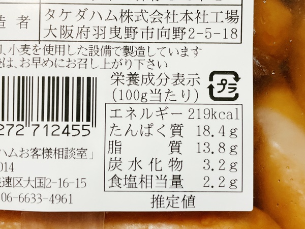 原材料にはいろいろ入っているけれども栄養成分をみると、低糖質ダイエットには向いているように思えます。むしろ優秀。100gあたり219kcalでタンパク質は18.4g、脂質が13.8gと気になるけど、炭水化物が3.2gなのでケーキとかチョコ食べるならカロリーも低めなので、こっちの方がダイエット向き。