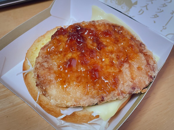 今回のマックの限定商品は『油淋鶏チーズチキンタツタ』ということなので、一応めくってみる。チキン上部には油淋鶏ソースでしょうか?そしてチキンはバンズと同じようなサイズでしっかりしています。