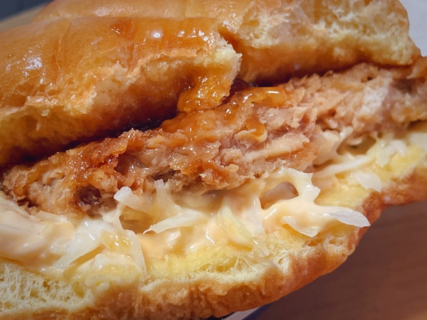 そして断面を見ると、ボリューミー。チキン上部には油淋鶏ソース。そして下はキャベツとまた別のソースが。こちら、調べてもクリーミーなソースとしか表示がなく…よくわからない。オーロラソース的な感じの印象。