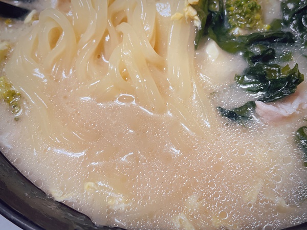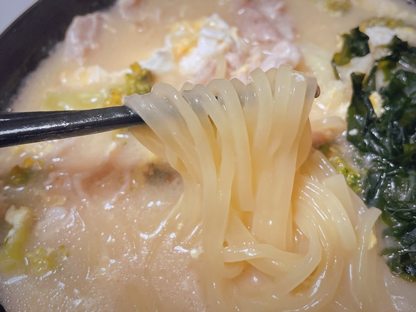 そしてスープ。鶏白湯という事で白濁しております。パッケージには濃厚という文字があったので、濃厚好きな私は期待大でスープを飲んだのですが…見た目と違ってちょっとあっさり。スープ自体は美味しいし鶏の旨味もでているのですが、濃厚鶏白湯か?と言われると、違う気がします。