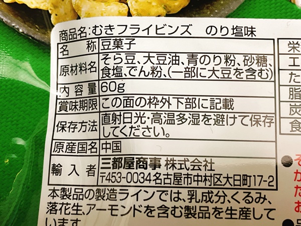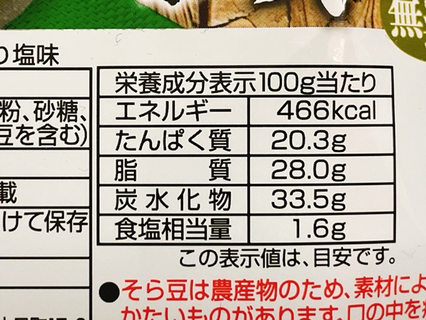 原材料は、そら豆、大豆油、青のり粉、砂糖、食塩、でん粉とシンプル。容量は60gと皮がない分、少し軽めですね。