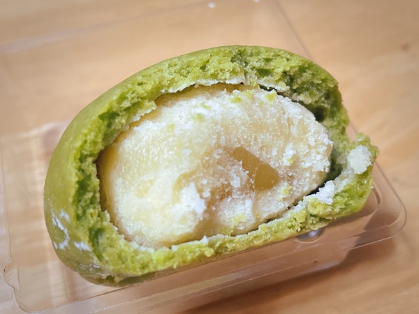 抹茶の皮の下にはぎゅうぎゅうに詰め込まれた白あんと中央には栗が入っています。抹茶の皮は通常のおまんじゅうに比べて少し硬めの皮で、中の白あんは想像していたよりも甘さが控えめ、栗は甘さを感じるのですが白あんと抹茶の皮とうまく調和していて面白い。