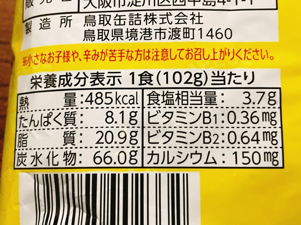そしてカロリーがこちら。油で揚げている麺という事で485kcal、たんぱく質は8.1g、脂質20.9g、炭水化物66g、食塩相当量3.7gとなっております。これはごく一般的な感じかな?