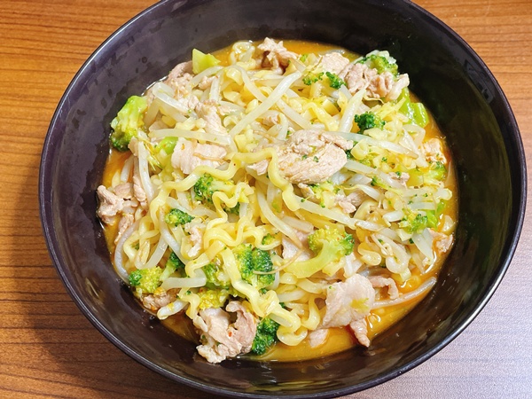 うーん、袋に書いてあるとおりの水で作ったのに…何故か水分量が多くなってしまいました。もやしと冷凍のブロッコリー入れたせいかな?と、少し残念な気持ちになっておりましたが、自分が悪いのでとりあえず食べてみます。