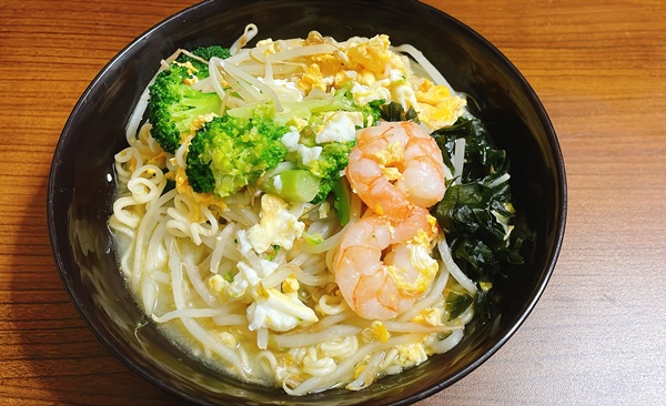 今回はもやし、ブロッコリー、海老、わかめ、卵をトッピング。こちらのラーメン、まず香りがいい!商品名のすだち香るに偽りなし★サッポロ一番の期間限定はクオリティ高いと思います。