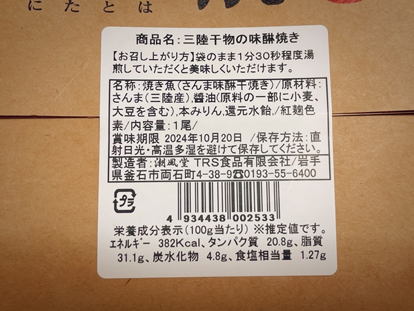 こちらはさんまよりもしっとり感が強め。そして味付け、醤油と麹との事ですが麹感は控えめですね。控えめというか醤油の風味を崩さない、いいバランスで麹を使っていると思います。これもご飯が進む味付けで美味しい!こちらの商品を作っているのは岩手県釜石市の会社『潮風堂』さんなんですが、味付けがとってもいいですね。
