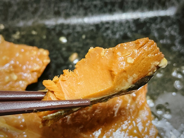 鮭の身もしっかりしているし、こちらも初めは焼き魚っぽくないのに食べ進めると焼き魚感が出てきて面白い。そしてさんまに比べると骨は少なめなんですが、こちらも骨は気にせず丸ごと食べられる仕様となっております。