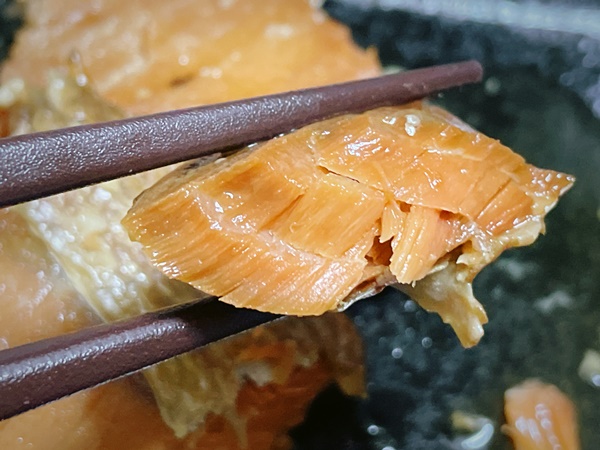 そして驚くべき所がこれ!見て、この骨の部分!骨の部分まで柔らかくて旨い!そして食べすすめていくと、どんどん焼き魚っぽくなっていって不思議!この商品、すごいかも。