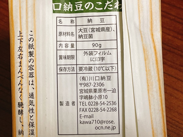 川口納豆さんは宮城県では有名な納豆屋さん!テレビ等でも紹介されているので、ご存じの方も多いかもしれないですね。色んな種類がある中で、今回私がチョイスしたのはこちらの『仙台大粒』です。