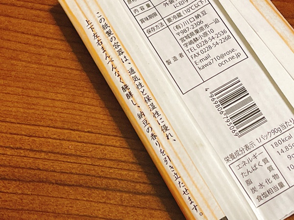 そして、川口納豆さんの好きな所がこちらの紙のパック!一般的なパックの容器と違って紙に包まれているのです。これがすごくいいの。まずゴミが減る。写真では透明の袋取っちゃってますが、紙パック+袋に入っているので、そのまま冷凍保存が可能。(しかもパック容器と違って薄いので、冷凍庫の隙間にフィット!)