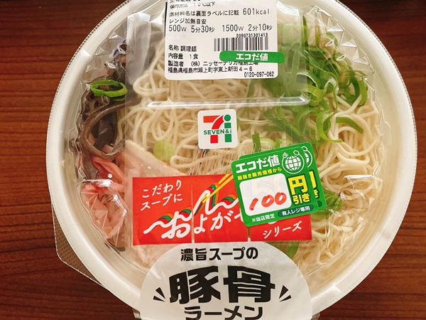 という事でこちらが今回のラーメン。こだわりスープにおよがせ麺シリーズ。『濃旨スープの豚骨ラーメン』税込572円ですが、エコだ値で100円引き。個人的に食べ物を捨てるのってとっても嫌なので…こういう取り組みとっても大事だと思います。